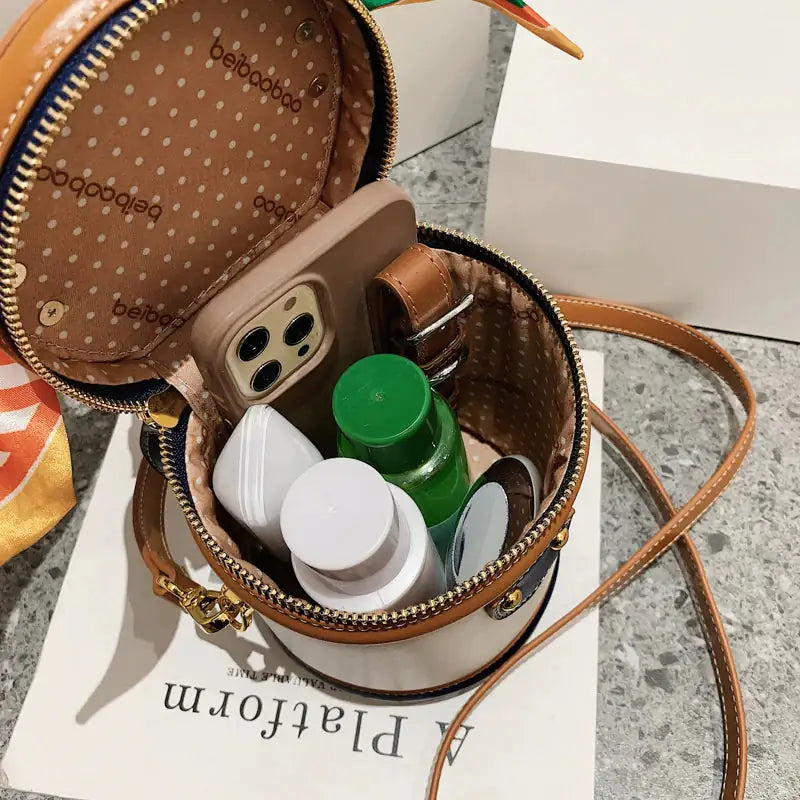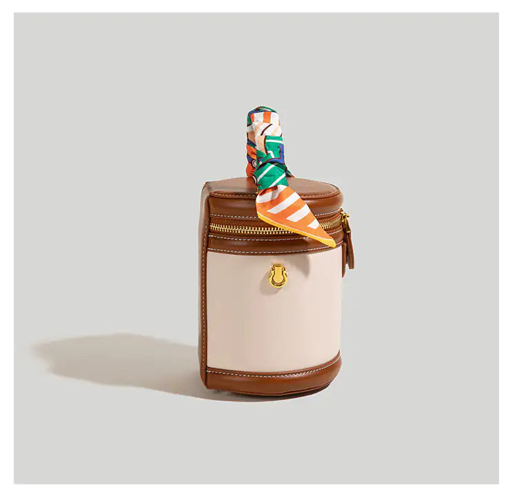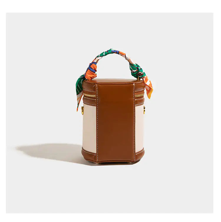 Featuring a scarf-adorned top handle, this bag doesn't compromise on practicality. Ample compartments ensure organized storage for essentials, while the cylindrical shape adds a touch of uniqueness.